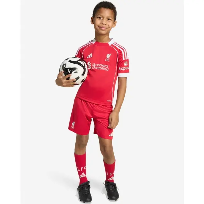 Kicking off our third spell together, the LFC adidas Kids 25/26 Home Mini Kit brings some real mid-’00s football vibes with a clean, crisp look and white piping on the shirt. Sized for kids, this version includes a jersey and shorts. Moisture-managing AEROREADY will keep them comfy in the colours they’ll love for the rest of their lives.