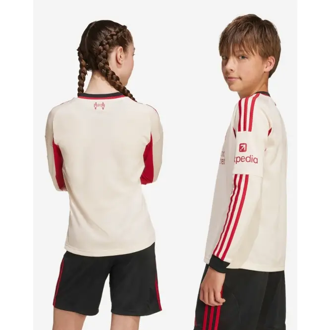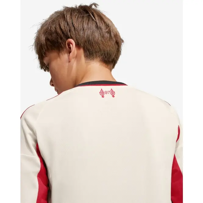 Created to represent Liverpool FC’s iconic home ground on away days, this LFC adidas Youth Away Long Sleeve Jersey for juniors displays a specially made crest whose shape was inspired by the arched gable atop Anfield’s old Main Stand. Moisture-managing AEROREADY and soft fabric combine to keep travelling fans comfortable. The off-white shade will be familiar to Reds who know their history.