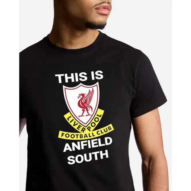 - Black short sleeve crew neck t-shirt with THIS IS ANFIELD SOUTH print to front chest.