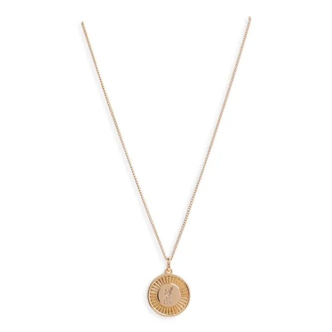 - Gold Plated Brass Disc Pendant Featuring the LFC Liverbird and Branding, hanging on a Gold Plated Brass Chain.