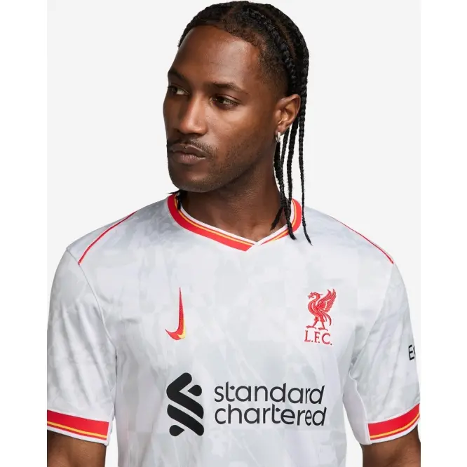 • White Jersey with LFC Liverbird badge, LFC sponsors and a unique upward dual Nike swoosh.