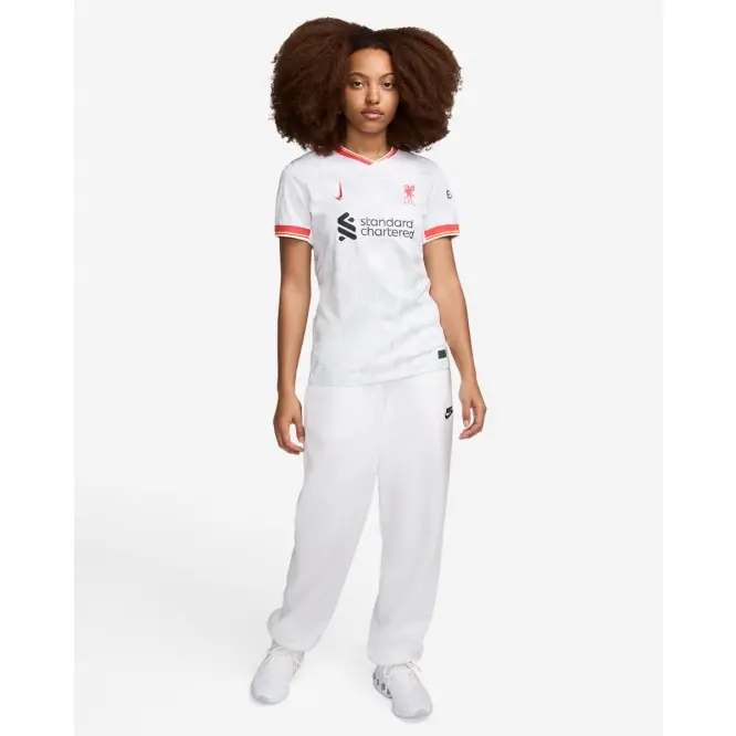- White Jersey with LFC Liverbird badge, LFC sponsors and a unique upward dual Nike swoosh.