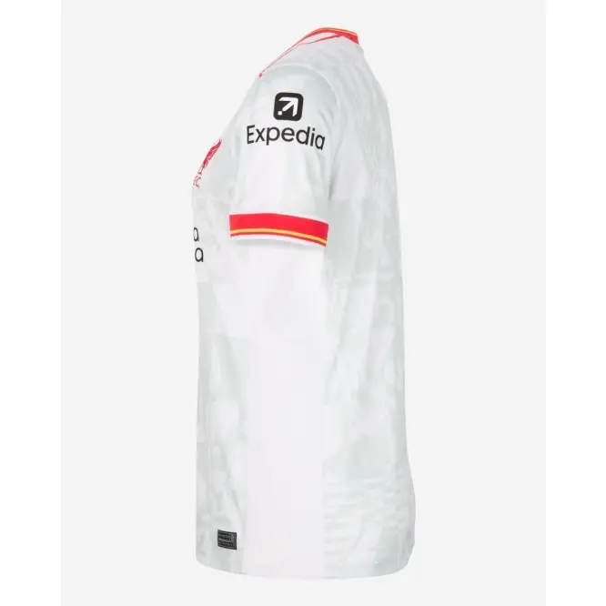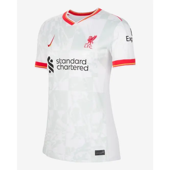 - White Jersey with LFC Liverbird badge, LFC sponsors and a unique upward dual Nike swoosh.