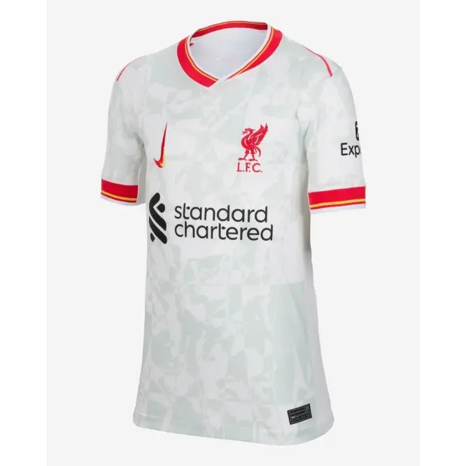 - White Jersey with LFC Liverbird badge, LFC sponsors and a unique upward dual Nike swoosh.