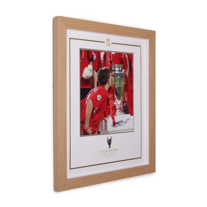 Presented in an ornamental wooden frame, this image is of our Champions League winning former Captain Steven Gerrard just before he lifted the Clubs 5th European Cup.